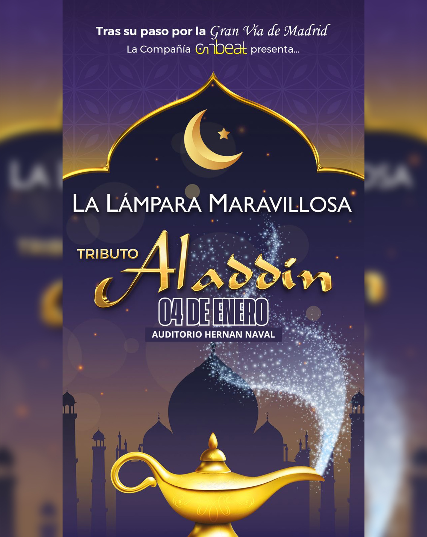 Tras el éxito en la Gran Vía de Madrid, La Lámpara Maravillosa, El Tributo de Aladdín recorre la península. La Compañía Onbeat nos presenta la historia de Aladdín el tributo como nunca antes se había hecho, a través del Genio y son temas musicales de Broadway jamás cantados en España. La Compañía Onbeat nos presenta la historia de Aladdín el tributo como nunca antes se había hecho, a través del Genio y son temas musicales de Broadway jamás cantados en España. A las canciones archiconocidas como El Genio tan Genial o Un Mundo ideal se unen otras melodías con increíbles voces en directo, atractivas coreografías llenas de vida y un vestuario propio de los palacios de Oriente; sin olvidar un homenaje a Bollywood… ¡Un musical que gusta a pequeños y mayores! Con atractivas coreografías llenas de vida y un vestuario propio de los palacios de Oriente; sin olvidar un homenaje a Bollywood…